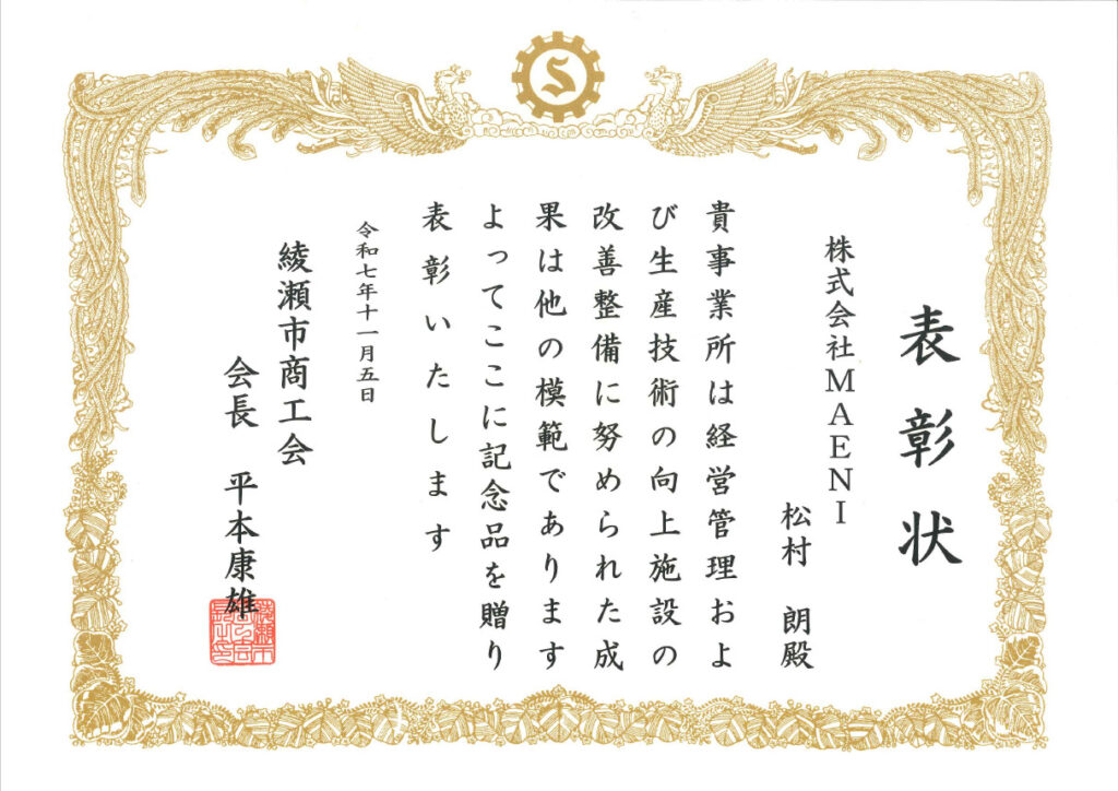 このたび当社は、綾瀬市商工会より「優良事業所 商工会長賞」を受賞いたしました。